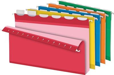 Pendaflex Ready-Tab extra-capacity hanging folders feature 6 built-in tabs for faster file setup. Simply lift the tab in the position you need. The 2" capacity with cardboard reinforcement insert easily accommodates large files, and the folder is reinforced at top edge and bottom fold for additional durability. Legal size. Assorted colors