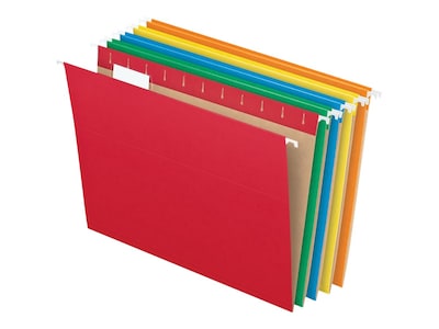 Pendaflex recycled hanging folders are a smart option for everyday filing. Color folders are made from 100% recycled fiber with 60% post-consumer fiber. The files include clear 1/5-cut tabs and inserts.