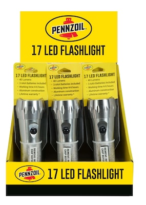 Pennzoil 17 LED flashlight has a durable aluminum body and a lifetime guarantee. This hand-sized flashlight has a push-button switch and attractive diamond-cut textured body that provides a secure grip even in wet weather. The perfect size to store in your glove compartment or car door pocket. 3 AAA batteries are included.