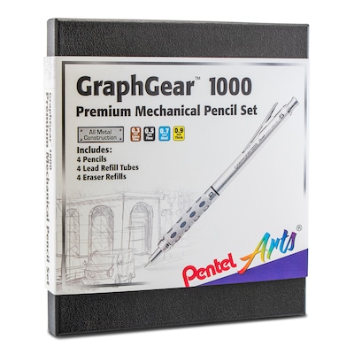 The Pentel GraphGear 1000 mechanical pencil is a superior drafting pencil for architects, draftsmen, artists and enthusiasts. The 4mm tip design makes it ideal for use with rulers and templates. A unique, dual-action retractor advances and retracts the pencil tip to protect lead from breaking. The built-in lead hardness indicator allows you to easily identify your lead type. It comes pre-loaded with super Hi-Polymer HB lead, which never needs sharpening and produces a clear dark line. The finely chiseled metallic grip inlaid with soft, latex-free pads makes extended writing and drawing comfortable. Set includes 4 pencils in 0.3mm, 0.5mm, 0.7mm and 0.9mm, along with refill leads and erasers.