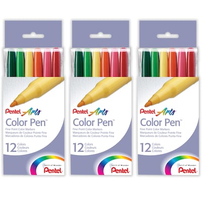 These fiber-tipped pens create radiant fine lines in intense water-based colors. Snap fit cap help keep Color Pens lasting longer and prevent dry-outs. Certified AP by The Art & Creative Materials Institute. Each set includes fine point markers in 12 colors. Sold as 3 sets for a total of 36 pens.