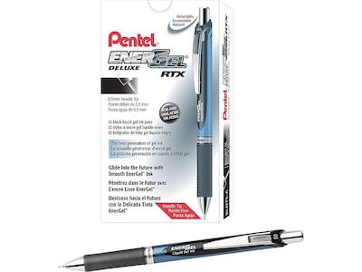 Write cleanly with this 12-pack of Pentel EnerGel Deluxe RTX needle-tip fine-point retractable black liquid gel-ink pens.