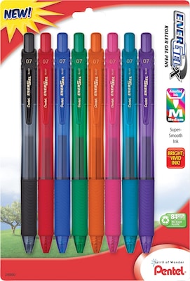 Pentel EnerGel-X RollerGel retractable medium-point gel-ink pens contain a quick-drying ink formula that reduces smudges and is perfect for left-handed writers who move quickly across the page. The assorted colors help staff create color-coded systems or vibrant graphics-based presentations and reports. A soft, latex-free grip makes handling each pen easier, while lightweight plastic construction reduces hand fatigue. Each pen contains 84-percent recycled plastic, which helps your business meet its sustainability goals by reducing landfill waste.