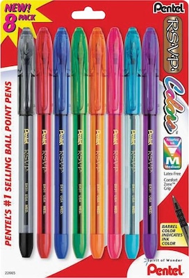 Make your writing stand out with these Pentel R.S.V.P. assorted ballpoint pens. The ink dries fast to prevent smudging and bleeding through paper, while the medium point lets you create brilliant, vivid lines. These Pentel R.S.V.P. assorted ballpoint pens come in eight vivid colors and are built with durable steel tips that provide consistent lines without skipping.