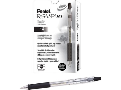 Enjoy smooth, consistent lines while writing papers or working on other projects with these dozen Pentel R.S.V.P. RT black medium-point ballpoint retractable pens.