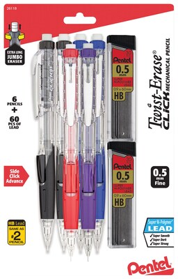 Twist-Erase® Click features clear barrels with color accents. Quick-click side button advances lead. 0.5mm Lead SIze. Pre-loaded with Super Hi-Polymer® HB lead.