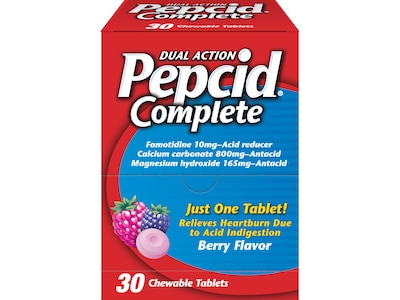 The Pepcid Complete is a chewable tablet that provides dual-action heartburn relief that works fast and lasts. It combines an antacid that starts neutralizing acid in seconds with an H2 blocker, famotidine, that helps control acid all day or all night. Pepcid has provided safe and effective heartburn relief for 35 years when used as directed.