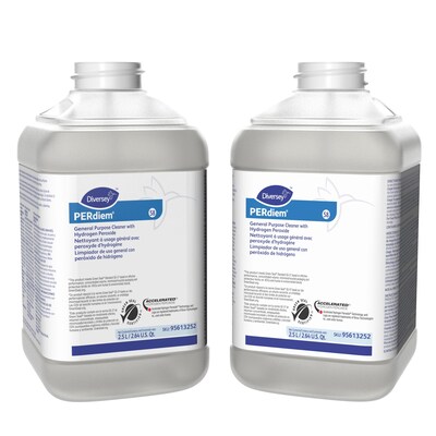 Tackle the toughest messes on various hard surfaces with this general purpose cleaner. Designed for use with J-Fill dispensing systems, this concentrated cleaner accommodates a variety of dilutions for cleaning everything from carpets to windows. This Diversey Perdiem general purpose cleaner comes in a 2-count carton and features powerful accelerated hydrogen peroxide technology, ideal for effective and efficient use in hospitals and commercial kitchens.