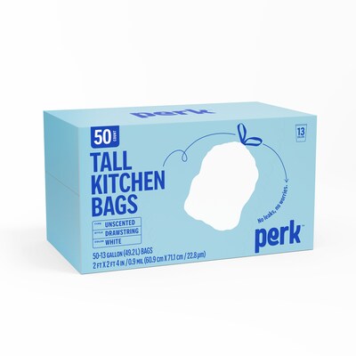 Make it time for a clean start with these drawstring trash bags. These bags have plenty of room for seconds with convenient drawstrings that keep every mess contained. See the white lining in your day with an ample size that effortlessly handles everyone's lunch leftovers. The convenient dispensing for these Perk™ 13-gallon white drawstring trash bags keeps them from escaping and lets you grab one bag at a time.