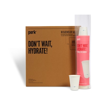 Join hydration nation with this 500-count carton of paper hot cups. Lined interiors keep beverages from making an unexpected appearance, while the generous size can handle your morning java jolt. Ten individual sleeves of 50 cups each mind their own business in your break room cupboard until you're ready to use them. These Perk 12-ounce white paper hot cups are disposable to keep communal sinks clean.