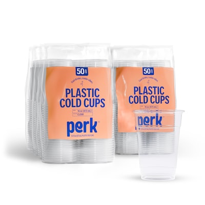 Have your drink and see it too with these 16-ounce clear plastic cups. The carton of 500 lets you be generous in the break room. With a stackable design, these Perk™ 16-ounce clear plastic cold cups keep it simply stacked in the cupboard.