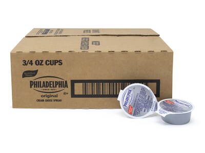 Savor the creamy, rich taste of Philadelphia Regular cream cheese spread in a convenient portion-control cup. The size is perfect for breakfast on the go. Light, ultra-creamy, and perfectly-portioned, this Philadelphia Regular cream cheese spread makes it easy to adorn bagels with a timeless topping. This cream cheese is packaged in handy plastic 0.75 oz. portion cups, which maximizes convenience for guests of your restaurant, diner, school cafeteria, or convenience store. Provide these cream cheese cups in your to-go bags with fresh-baked bagels at your bakery, or offer them as part of your hotel's breakfast bar so your patrons can take as much cream cheese as they need. Rich and delicious cream cheese spread is made with farm fresh milk and real cream.