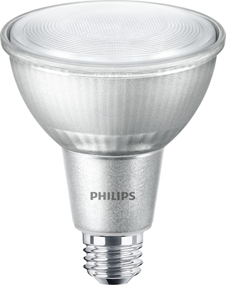 Philips Lighting AirFlux technology single optic LED lamp in silver finish, features screw-in E26 medium bulb base. The PAR30L, sealed-beam bulb has an average life of 25000 Hours and 40-Degree beam angle. This 10-Watt bulb outputs 800-Lumen of light with 2700K color temperature and 80 CRI. It has a voltage rating of 120 Volts AC and current rating of 110 Milli-Amps. It is suitable for use in damp locations.