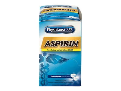 Reduce fevers with these easy-to-swallow, coated tablets. Each of these 50 tamper-evident packets contains two tablets, and they come in a perforated box for easy dispensing. With 325 milligrams of aspirin in each, these pills lessen discomfort from headaches, toothaches, and fevers. These Physicians Care tablets are ideal for first aid kits in the workplace.