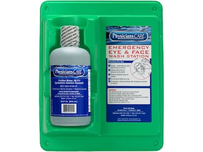 This PhysiciansCare wall-mountable eye flush station comes with a single 32 fl. oz. bottle of sterile isotonic buffered solution for flushing or irrigating the eyes. PhysiciansCare wall mountable eye flush station with single 32 ounce bottle. One bottle of sterile isotonic buffered solution (net weight 32 fluid ounces) for flushing or irrigating the eyes on a wall mount ready station. Station measures 11-3/4" Length x 4" Width x 13-3/4" Height. PhysiciansCare eye wash solution helps to clear eyes of foreign material such as dust, pollen, and chemicals, and to relieve itching and burning of the eyes and skin.