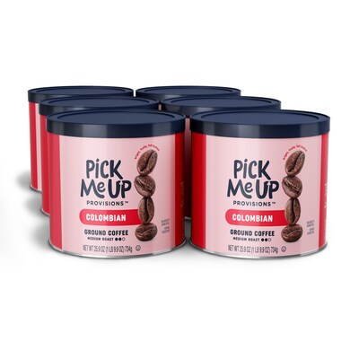 Refuel anytime with the bold, invigorating taste of Pick Me Up Provisions Colombian coffee! Crafted from 100% Arabica beans, this medium roast delights with a bright, fruity flavor and full-bodied richness that satisfies every sip. Packaged in a convenient 25.9 oz resealable canister, it locks in freshness, keeps your coffee cravings covered, and is the perfect addition to any breakroom.