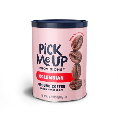 Refuel anytime with the bold, invigorating taste of Pick Me Up Provisions Colombian coffee! Crafted from 100% Arabica beans, this medium roast delights with a bright, fruity flavor and full-bodied richness that satisfies every sip. Packaged in a convenient 40.3 oz resealable canister, it locks in freshness, keeps your coffee cravings covered, and is the perfect addition to any breakroom.