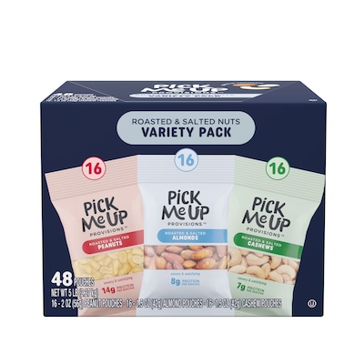 Satisfy your cravings with Pick Me Up Provisions™ 48-count variety pack of roasted and salted nuts.