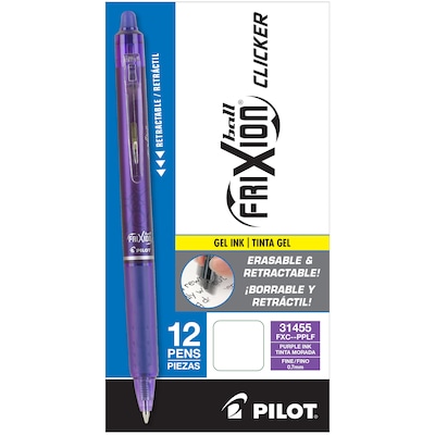 - Includes 12 Fine Point (0.7mm) Pilot FriXion Clicker Erasable Purple Gel Ink Pens