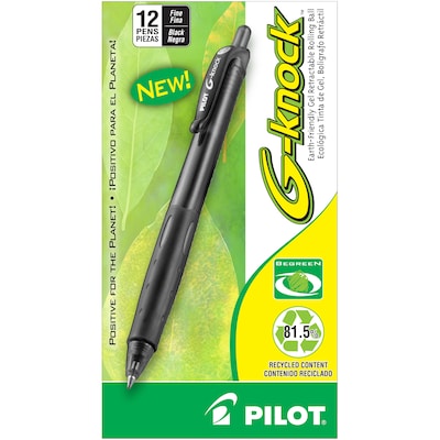 Enhance your writing performance by using this 12-pack of Pilot G-Knock BeGreen fine-point black retractable gel-ink rolling ball pens.