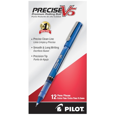 Enjoy the vivid, rich color of these premium extra-fine-point blue rolling ball stick pens. The barrel is see-through to let you monitor the ink supply, preventing you from running out without warning. These Pilot Precise V5 premium extra-fine-point blue rolling ball stick pens are packaged by the dozen and feature a special liquid ink formula to ensure smooth, consistent strokes.