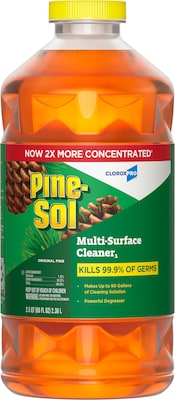 With the Pine-Sol Multi-Surface Cleaner from CloroxPro, you only need one product to fight tough dirt, grease, and grime. A two times concentrated formula delivers more cleaning power per drop than previous Pine-Sol Pine formula. Easier to handle and easier to store, the space-saving bottle gives you more cleaning solution in a smaller bottle made of 50% less plastic. This multipurpose cleaner cleans, deodorizes, and disinfects in one step, killing 99.9% of germs and leaving a classic pine scent. The cleaner cuts through grime and soap scum and is safe for use on wood, tile, stone, glass, and more when used as directed on hard nonporous surfaces.