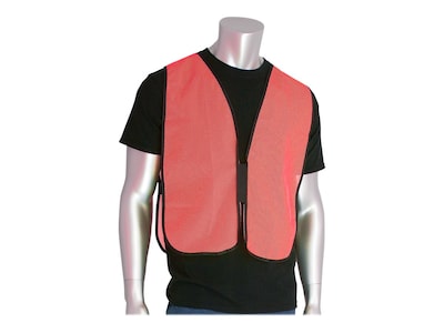 Stay visible by wearing this orange safety vest. Made of breathable mesh, this vest remains comfortable even in hot and humid conditions, and side elastic and a hook-and-loop closure ensure one size fits most, making it perfect for sharing. This PIP non-ANSI orange safety vest is ideal for parking lot attendants, dog walkers, survey crews, and any low-risk activities that don't require ANSI compliance.
