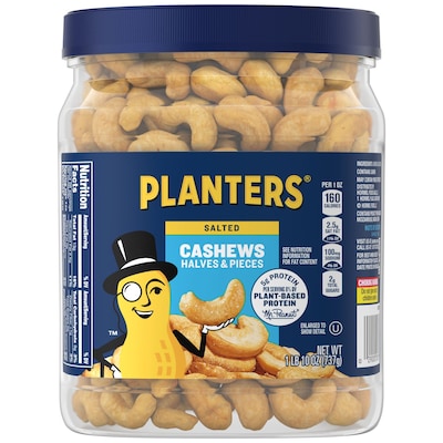 Offer family members and guests a healthy snack option with this container of cashew halves and pieces. Full of nutrients, proteins, and healthy fats, cashews are a great option for a quick snack on the go. This container of Planters cashews is 26 ounces, offering an ample supply for the whole family.