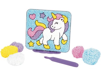 - Includes five colors, unicorn themed canvas with divided sections, squisher tool, and stand for display