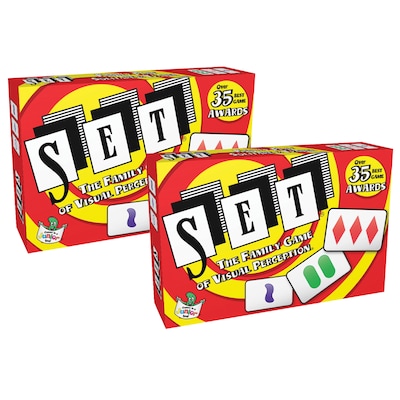 The award-winning game challenges players to race to find as many SETs as they can! A SET is three cards where each individual feature (color, shape, number and shading) is either all the same OR all different! The first player to see a SET calls out "SET" and grabs the cards—there are no "turns" and no luck here! And not only is it fast-paced fun, it also builds skills and exercises the brain! Because it has a rule of logic, and because players must apply this rule to the spatial array of patterns all at once, they must use both left brain and right brain thought processes! At the end of the game, the player with the most SETs wins! SET is prefect for a wide age range and number of players (including solo play!), and is a fun intergenerational game as well. Sold as a pack of 2 identical games.