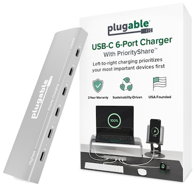 This Plugable Docking Station is a sleek, eco-conscious multi-port station that transforms any standard USB-C PD charger (18–100 W) into a smart power hub. Featuring Plugable’s patented PriorityShare technology, it intelligently prioritizes charging—allocating maximum power to the leftmost device first and cascading energy to others as they fill up. Built with 50 % recycled plastic and 75 % recycled aluminum, it significantly reduces electronic clutter and e-waste by eliminating the need for six separate adapters. The PS-6CC is also safe and reliable, with over-voltage and overcurrent protection, and vivid LED indicators for monitoring status. Compact and versatile, it’s ideal for travelers, families, offices, or classrooms—anywhere you want to charge multiple USB-C devices efficiently using a single power brick.