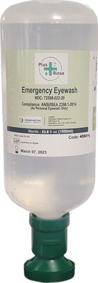 Plus Rinse Sterile Saline eyewash 33.8 oz (1000ml) bottle #45971 with an ergonomic eyecup, pack of 2. The Plum ergonomic eye cup ensures that the liquid can be applied in an even, gentle and concentrated flow. Sterile saline rinsing solution for dust - dirt - wood - solvent or oils incidents. Sterile eyewash solution is essential to negate any risk from bacteria and germs that could lead to eye infections from other eyewash solutions. Solution has a 3 year expiration. Refill bottle for Plum eyewash unit #48169 or compatible stations.