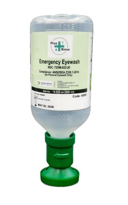 Plus Rinse Sterile Saline eyewash solution, 16.9 fl oz (500ml) bottle #45981, box of 12. Complete with the Plum ergonomic eyecup for a gentle concentrated rinsing of the eye. Sterile saline rinsing solution for dust - dirt - wood - solvent or oils incidents. Sterile eyewash solution is essential to negate any risk from bacteria and germs that could lead to eye infections from other eyewash solutions. Refill for Plum units: #45504, #46506, #45852, #45832, #45507, #45118, #46948, #46498 and #45509.