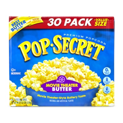 Treat the whole office to a comforting, tasty snack with this 30-count box Pop Secret premium movie theater butter popcorn.
