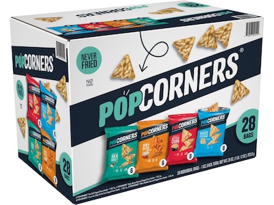 The Popcorners are the delicious, low-calorie snack that makes it easier than ever to snack better. Convenient on-the-go snacks are great for a busy lifestyle, at work, kids' lunch, snacks, and much more. Your taste buds will thank you. So, go ahead. We dare you. Individually bagged for grab-and-go convenience. Flavors include Sea Salt, Spicy Queso, Kettle Corn and White Cheddar. Made with no artificial flavors, colors, or preservatives