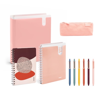 - Contains: 1" pocket binder, 18-month medium pocket book planner for 2023-2024, Elements spiral notebook, set of 12 gel pens with black ink, and pencil pouch