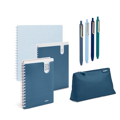 - Contains one-subject notebook, one-subject pocket spiral notebook, medium 18-month pocket book planner for 2023-2024, four gel pens (sky, slate, teal, and navy), and medium accessory pouch
