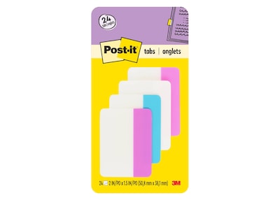 Post-it Tabs in 2 inch size create necessary order by easily organizing file folders. Solid color bars give you flexibility to organize by color. They are durable, you can write on them, and reposition as needed. They are also great for binders, planners and notebooks. They stick securely and remove cleanly. Assorted colors. Contains 6 tabs/color, 4 colors, 24 tabs/pack.