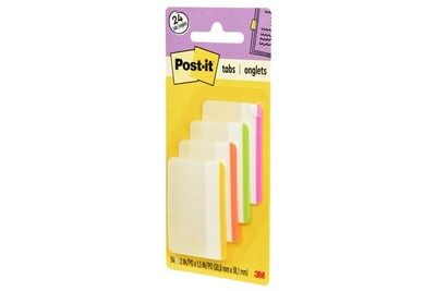 Post-it Tabs in 2 inch size create necessary order by easily organizing file folders. Lined color bars gives you flexibility to organize by color. They are durable, you can write on them, and reposition as needed. They are also great for planners, notebooks and file folders. They stick securely and remove cleanly. Assorted Bright Colors. Contains 6 tabs/color, 4 colors, 24 tabs/pack.