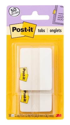 Post-it Tabs in 2 inch size create necessary order by easily organizing file folders. Solid color bars give you flexibility to organize by color. They are durable, you can write on them, and reposition as needed. They are also great for binders, planners and notebooks. They stick securely and remove cleanly. White. Contains 25 tabs/on the go dispenser and 2 dispensers/pack.