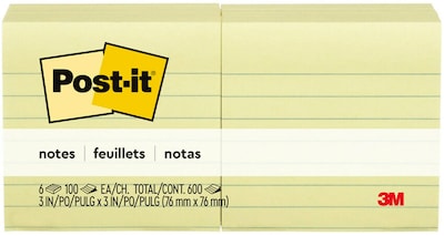 Post-it Sticky Notes, 3 x 3 in., 6 Pads, 100 Sheets/Pad, Lined, The Original Post-it Note, Canary Yellow