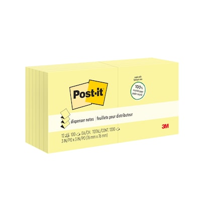 Post-it Greener Dispenser Notes, 3 in. x 3 in., are accordion-style notes specially designed to work in Post-it Note Dispensers. With these notes, you'll always have a note nearby to capture great ideas. Unique adhesive is designed to work on paper or in planners. Use for notes or reminders to yourself or others. Classic Canary Yellow color helps your notes stand out. Made with water-based adhesive and 100% recycled paper. Post-it Dispenser Notes are recyclable and the paper in Post-it Notes is sourced from certified, renewable and responsibly managed forests. 12 Pads/Pack, 100 Sheets/Pad.