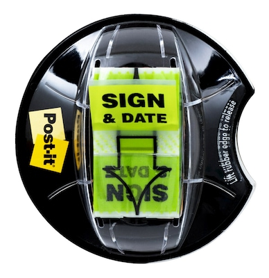 Find it fast with Post-it Sign and Date Message Flags in an eye-catching bright green color that gets noticed. They make it simple to mark or highlight important information within documents and files that require signatures. They stick securely, remove cleanly as needed. Draw focus to critical items that need attention. Handy desk grip dispenser keeps them ready for use at work, home or in the classroom. This pack contains 1 in. wide, 200 per Desk Grip Dispenser, 1 Dispenser/Pack.