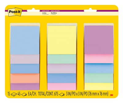 Post-it Super Sticky Notes, 3" x 3", Assorted Colors, 45 Sheets/Pad, 15 Pads/Pack (65415SSPS2)
