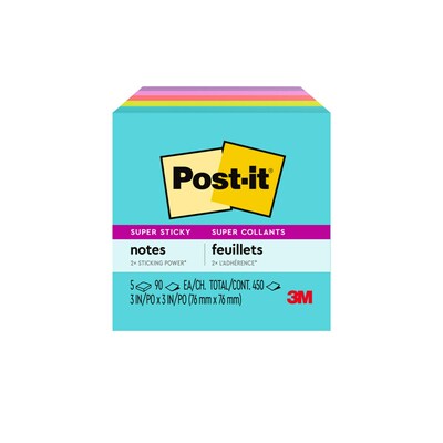 Post-it Super Sticky Notes, 3" x 3", Supernova Neons Collection, 90 Sheet/Pad, 5 Pads/Pack (654-5SSMIA)
