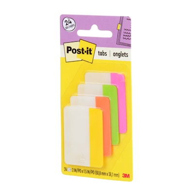 Post-it Tabs in 2 inch size create necessary order by easily organizing file folders. Solid color bars give you flexibility to organize by color. They are durable, you can write on them, and reposition as needed. They are also great for binders, planners, textbooks, notebooks and folders. They stick securely and remove cleanly when you are ready to change. This pack contains assorted bright colors - pink, lime, orange and yellow. Contains 6 tabs/color, 4 colors and 24 tabs/pack.