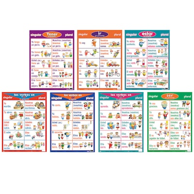 This 7-piece Spanish Verb Poster set is a colorful resource that motivates while teaching. Great for classroom and student reference. Made from durable stock. Perfect for the second language learner. Includes 7 large posters, 24" x 18" each.
