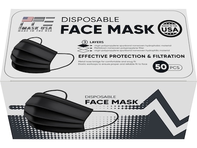 PPE Mask USA Disposable Surgical Cloth Face Mask, One Size, Black, 50/Box, 30 Boxes/Pack (TBN203204)