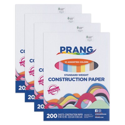 Prang 10 color assortment is perfect for beginner arts and crafts, and ideal for young children. Colors include: White, Sky Blue, Blue, Pink, Scarlet, Orange, Brown, Yellow, Green, and Black. Works great for cutting, pasting, doodling and folding. Recyclable. Measures 9" x 12". Each pack includes 200 sheets. Sold as 4 packs for a total of 800 sheets.