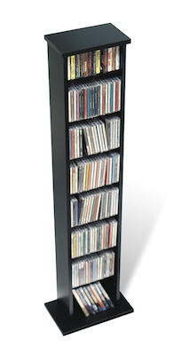 Prepac™ Slim multimedia storage tower in black finish features fully adjustable shelves that can accommodate any size and type of media collection. Tower is trimmed with stylish accent moldings for a sleek and traditional look.